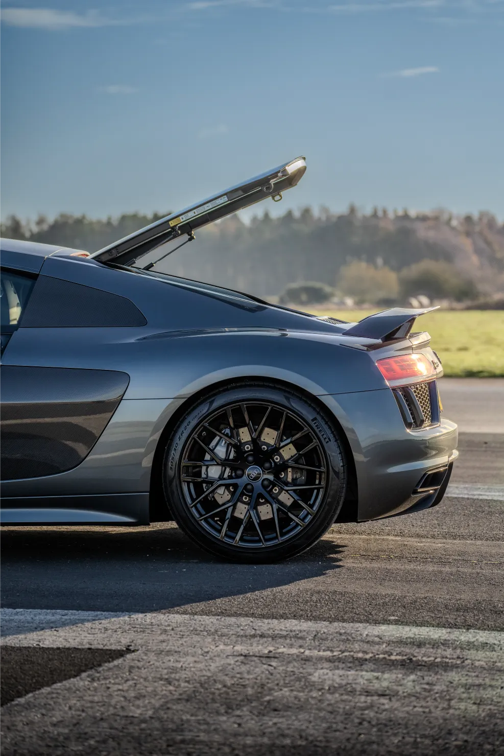 The shoot focused on contrast. The sleek, supercar proportions of the R8 against the muscular, boxy stance of the M2. The R8’s carbon accents, low slung profile, and black multi-spoke wheels caught the golden-hour sun perfectly, while the M2’s bold carbon-fibre splitter and canards reflected the surrounding sky’s cool, moody tones.