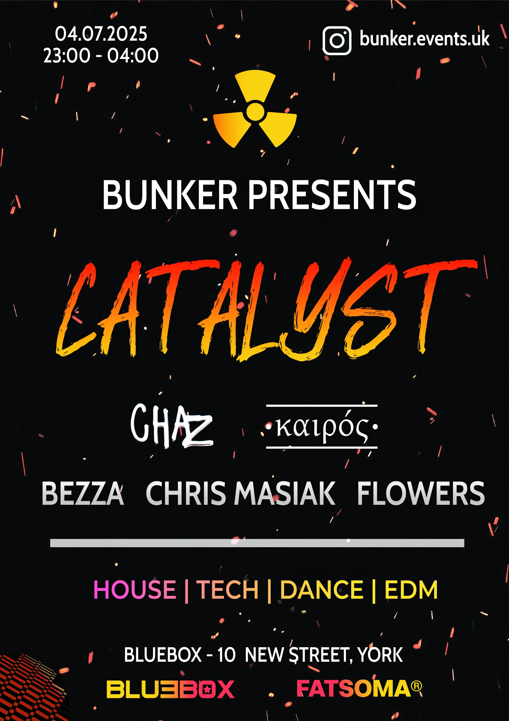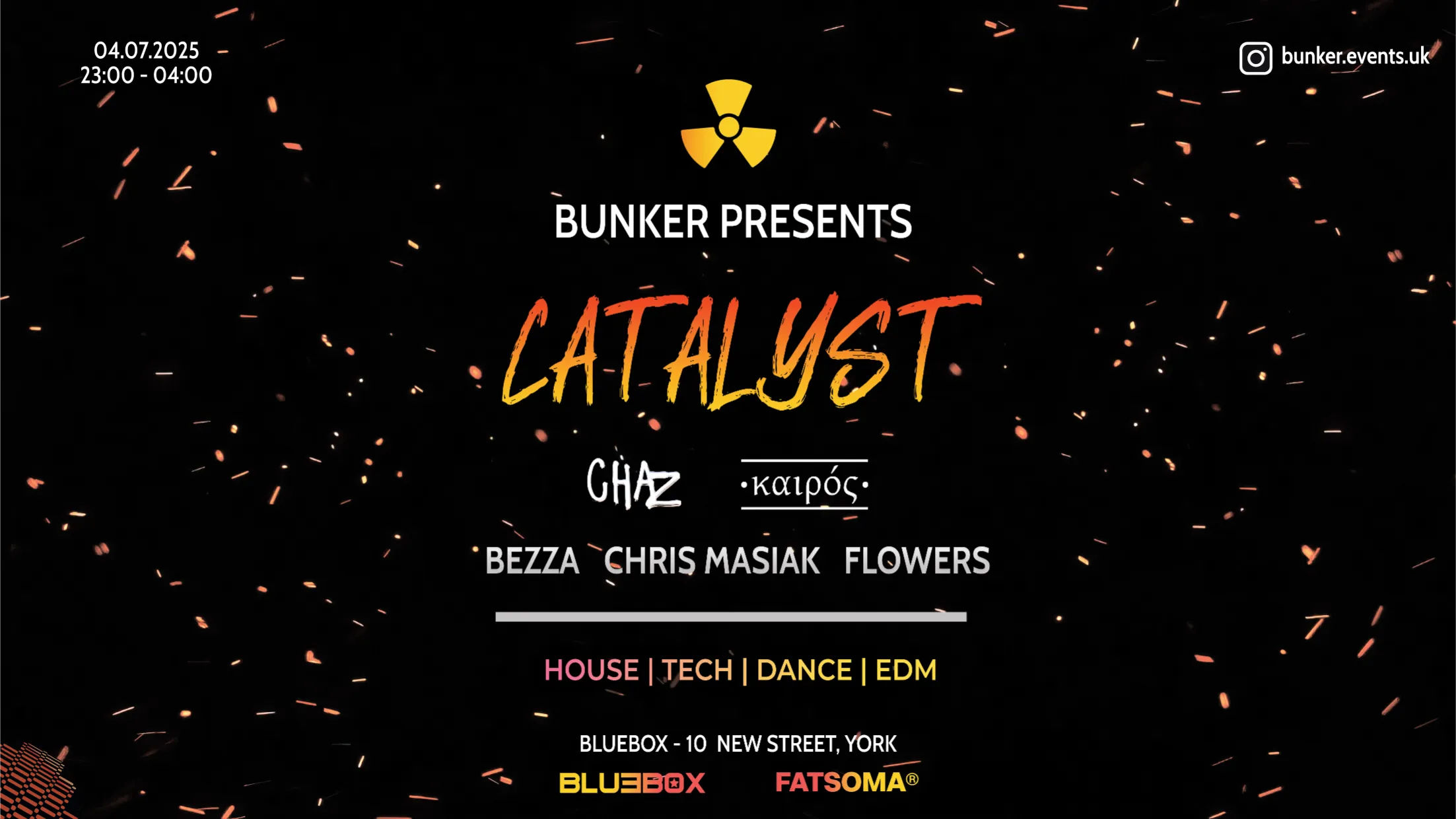 Bunker’s second event, Catalyst, held on July 4th, 2025 at Bluebox York, featuring CHAZ, Kairos, Chris Masiak x Bezza, Flowers & YesWebbo. A fiery night of House, Tech, Dance & EDM, designed to ignite the Bunker brand.
