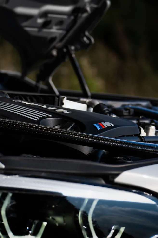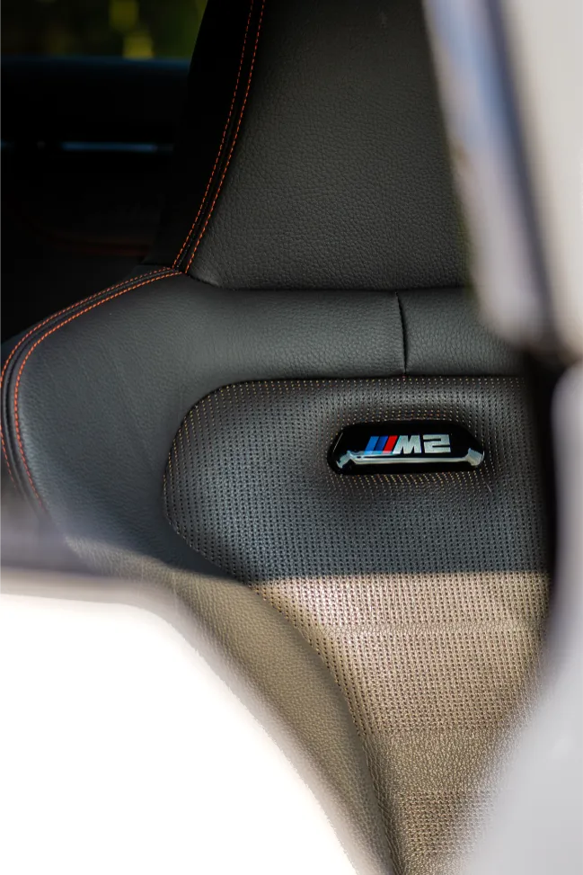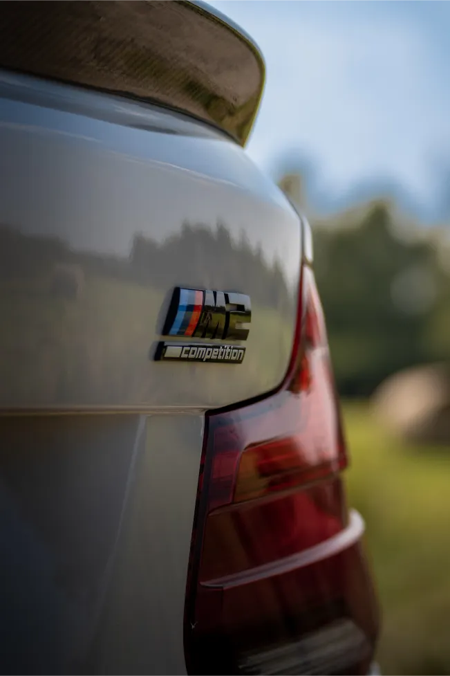 The hero image leads the viewer’s eye along the golden line of the tarmac straight into the M2’s sculpted front end, a composition that blends geometry and motion into a single frame. Close-up shots showcase fine details, including the M2 Competition badging, precision-engineered body lines, and the immaculately presented engine bay.