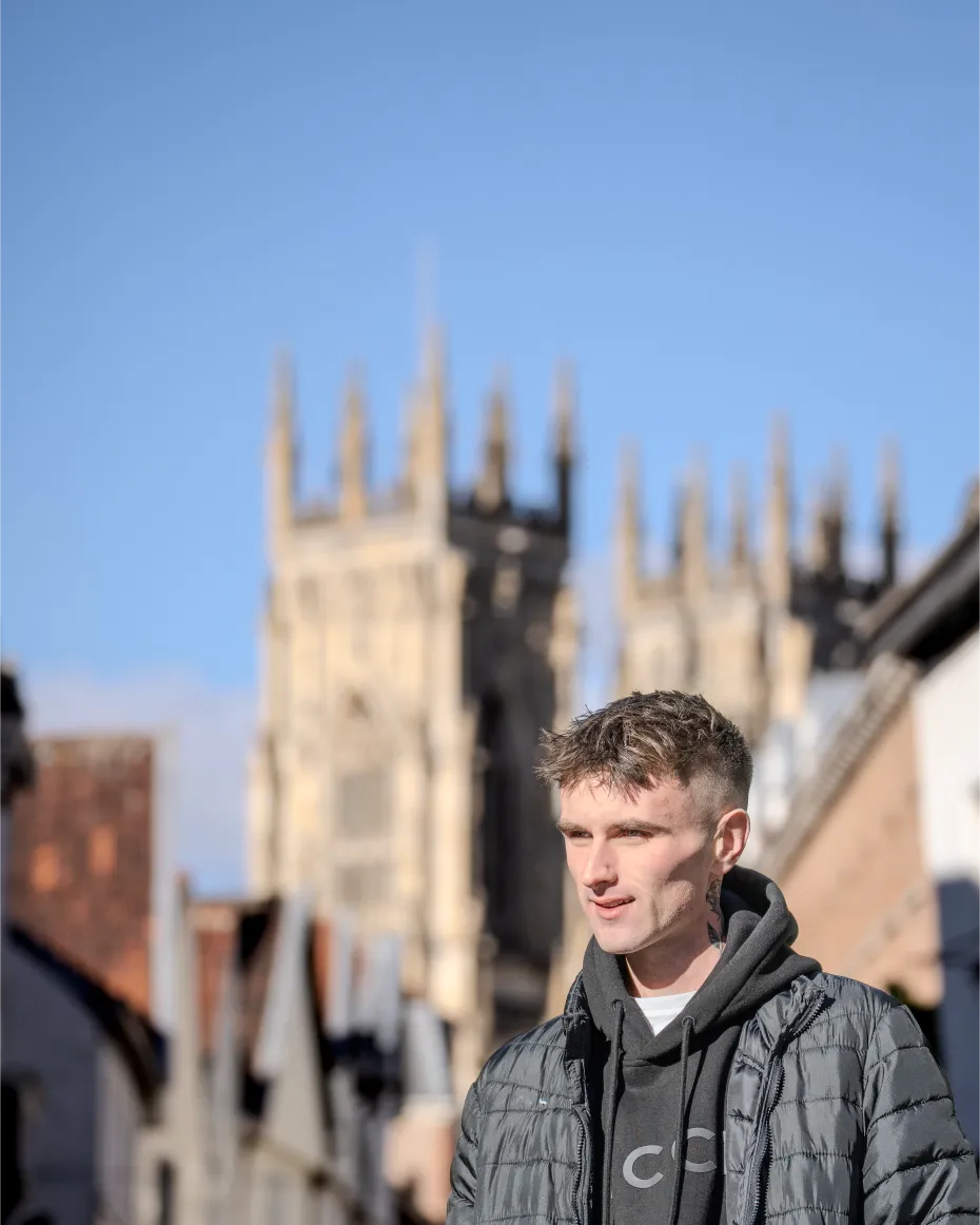 A press photoshoot with Liam Marshall (LMarsh) | House & Commercial DJ from York, captured on a windy autumn afternoon, exploring the Minster, Stonegate, and Museum Gardens with warm golden tones and city textures.