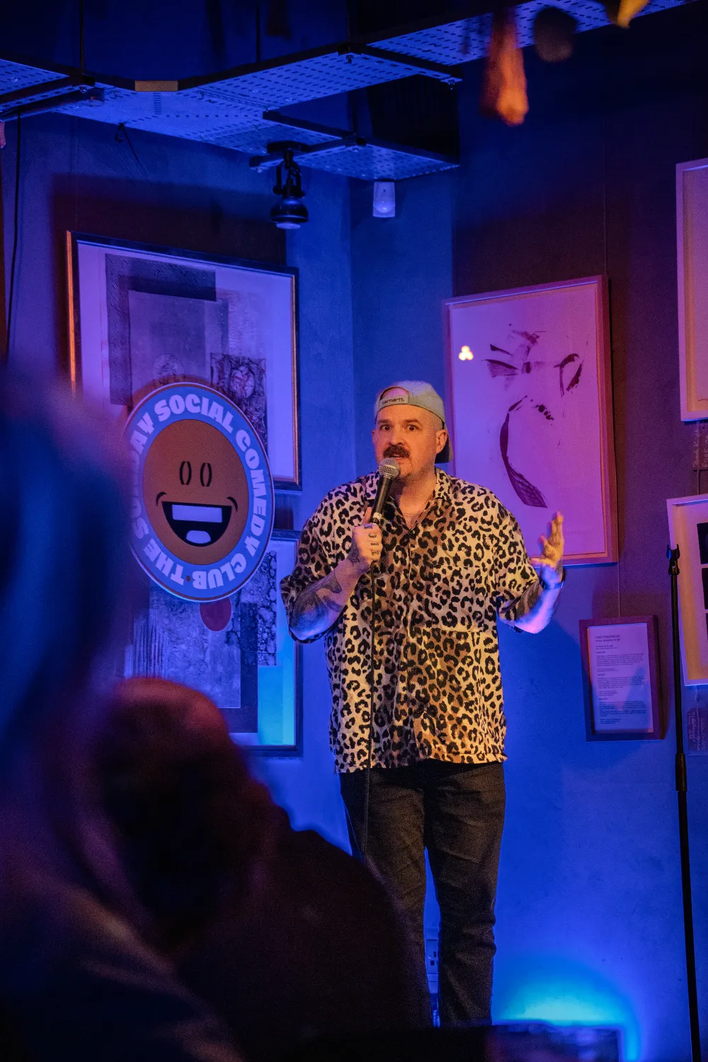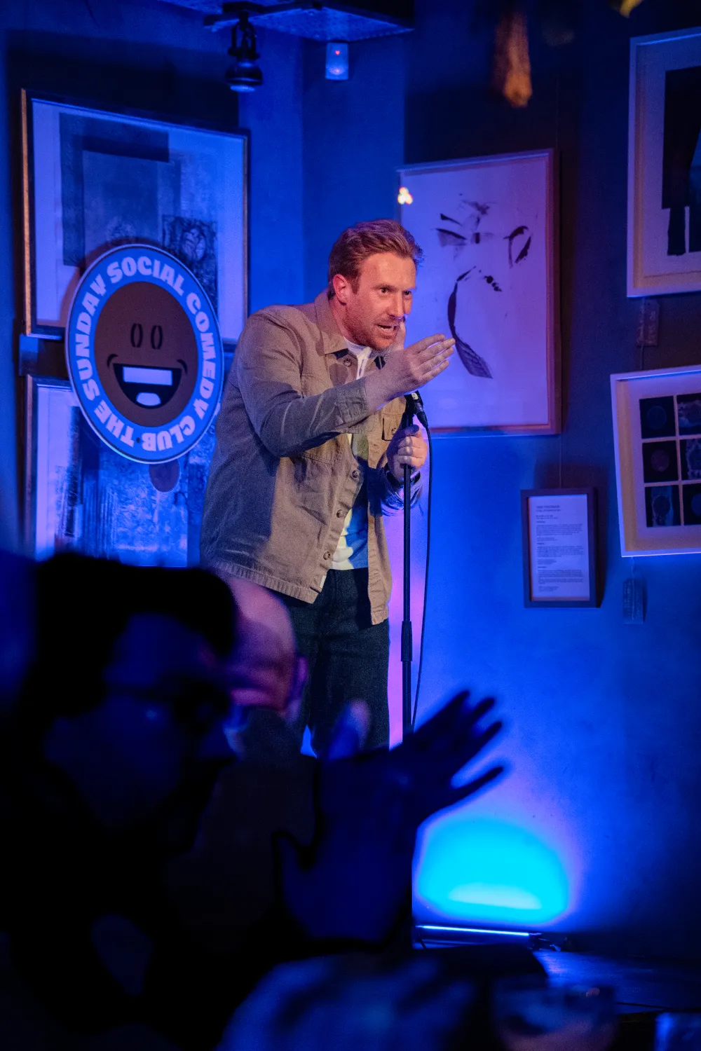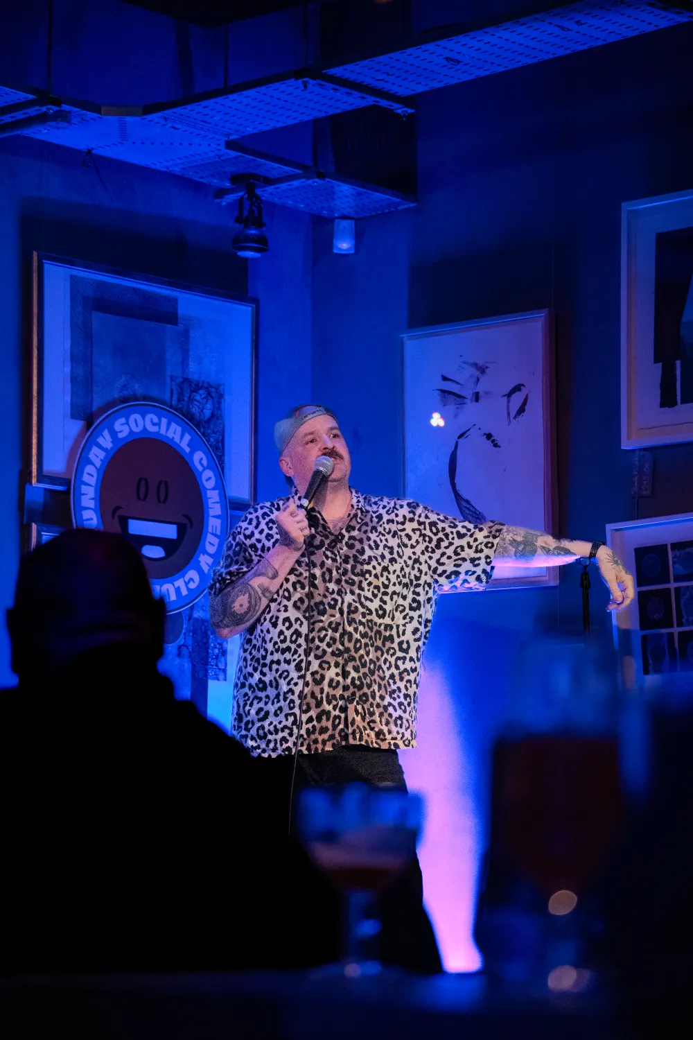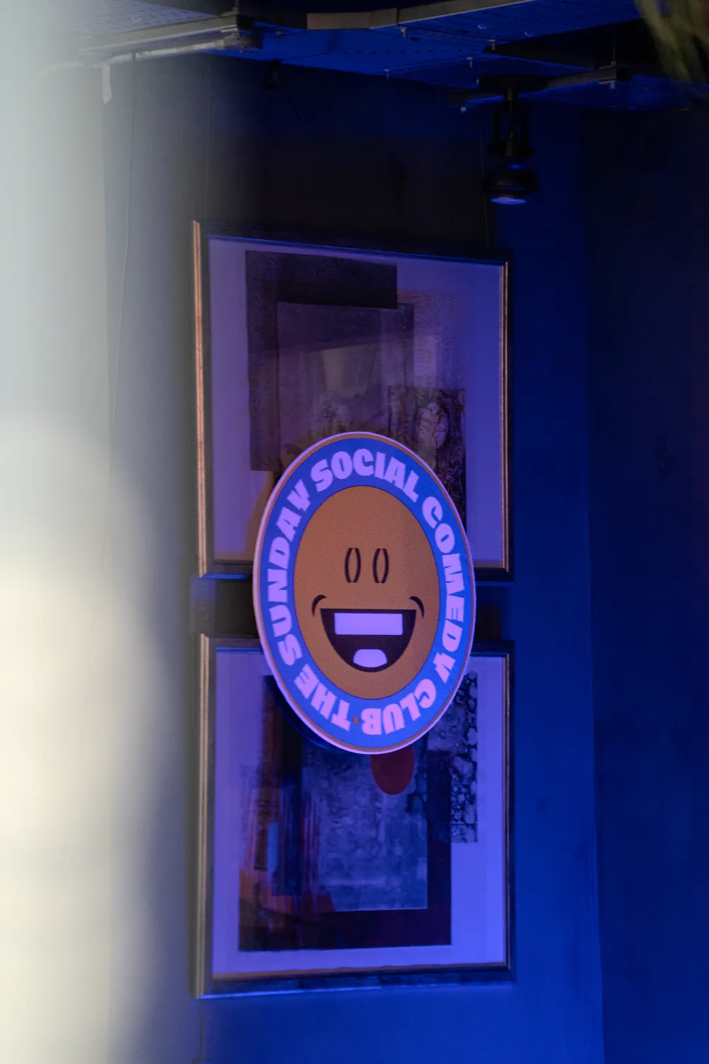 Each shot from the evening captures the genuine energy of live performance, from candid audience reactions to the expressive delivery of each comedian under the iconic Sunday Social smiley backdrop.