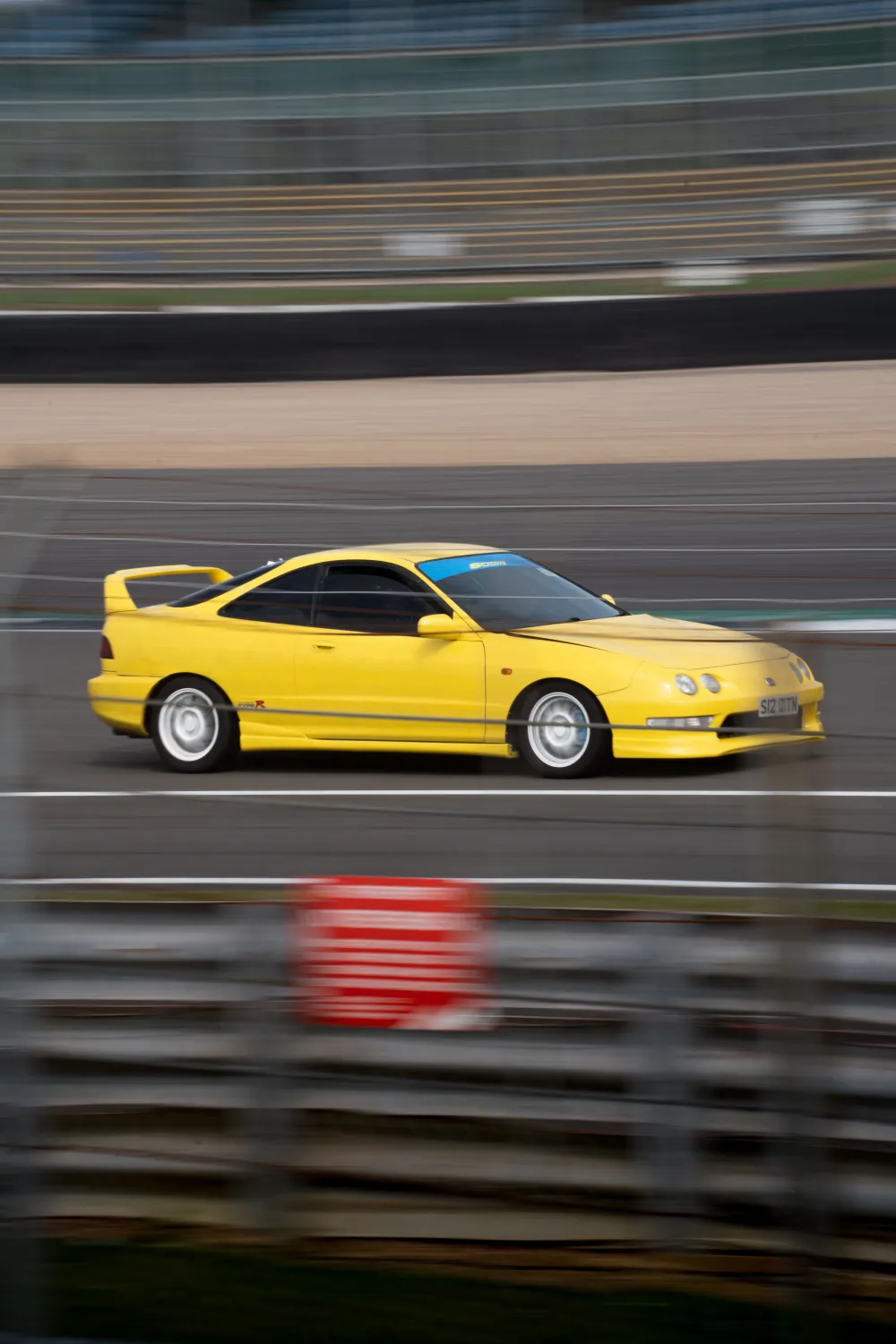 The highlight of the shoot features a Honda Integra Type R finished in luminous yellow, photographed in motion on the iconic Silverstone circuit. Using dynamic tracking techniques, each frame captures the intensity and speed of the moment, with rich motion blur and sharp focus on the car’s signature design lines.